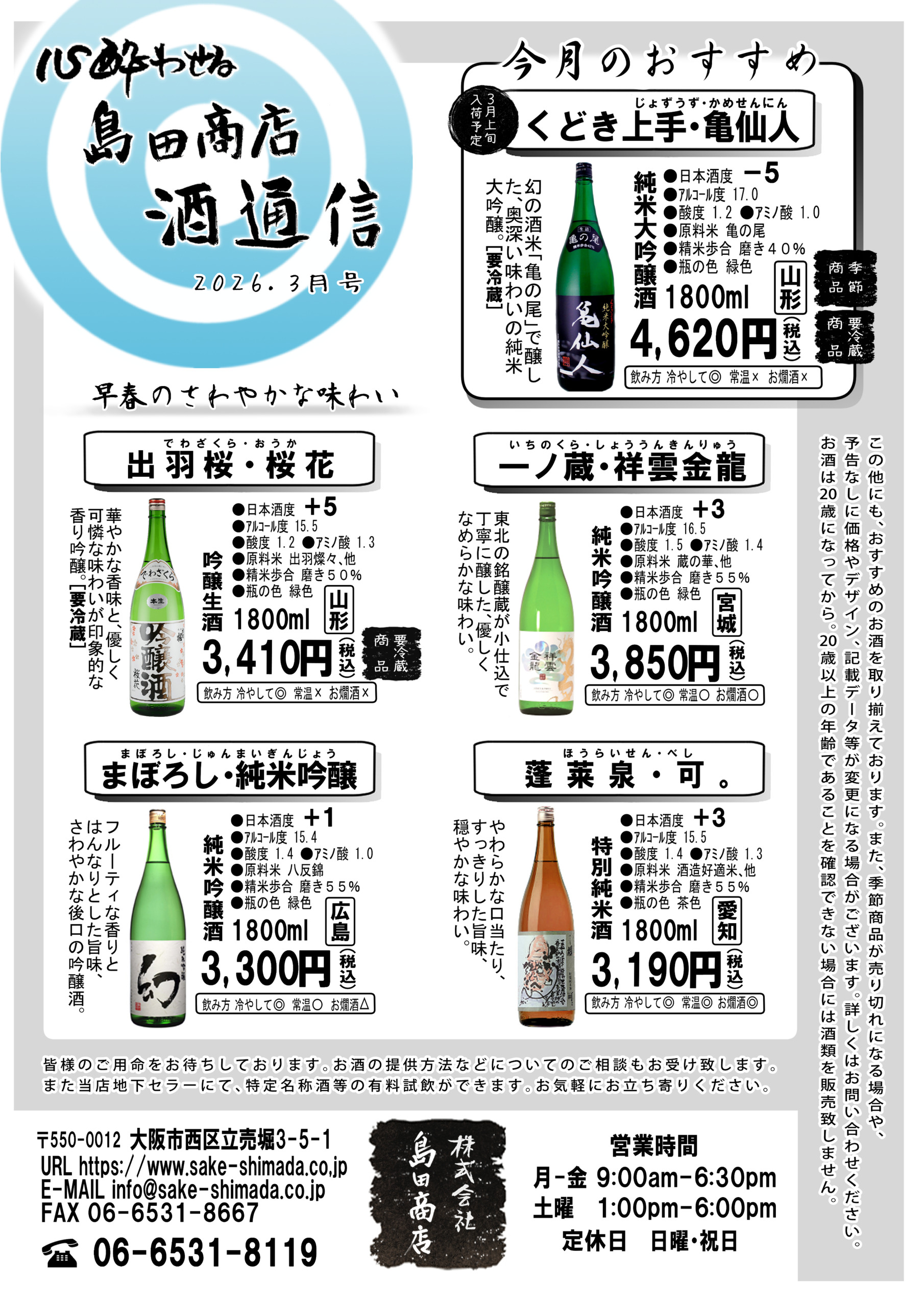 酒通信 酒通信 2026年3月号 2026.03.023月号の酒通信を更新しました。早春のさわやかな味わいの日本酒を中心におすすめしております。※クリックで画像が拡大されますくどき上手 亀仙人 純米大吟醸出羽桜 桜花 吟醸一ノ蔵 祥雲金龍 純米吟醸まぼろし 純米吟醸蓬莱泉 可。 特別純米写真はイメージです。商品によっては品切れ等の場合がございます。予告なしに価格改定、デザイン等が変更になる場合がございます。新着情報は、過去2年間くらいで更新しています。何卒ご了承ください。 2026年4月以降の価格改定商品